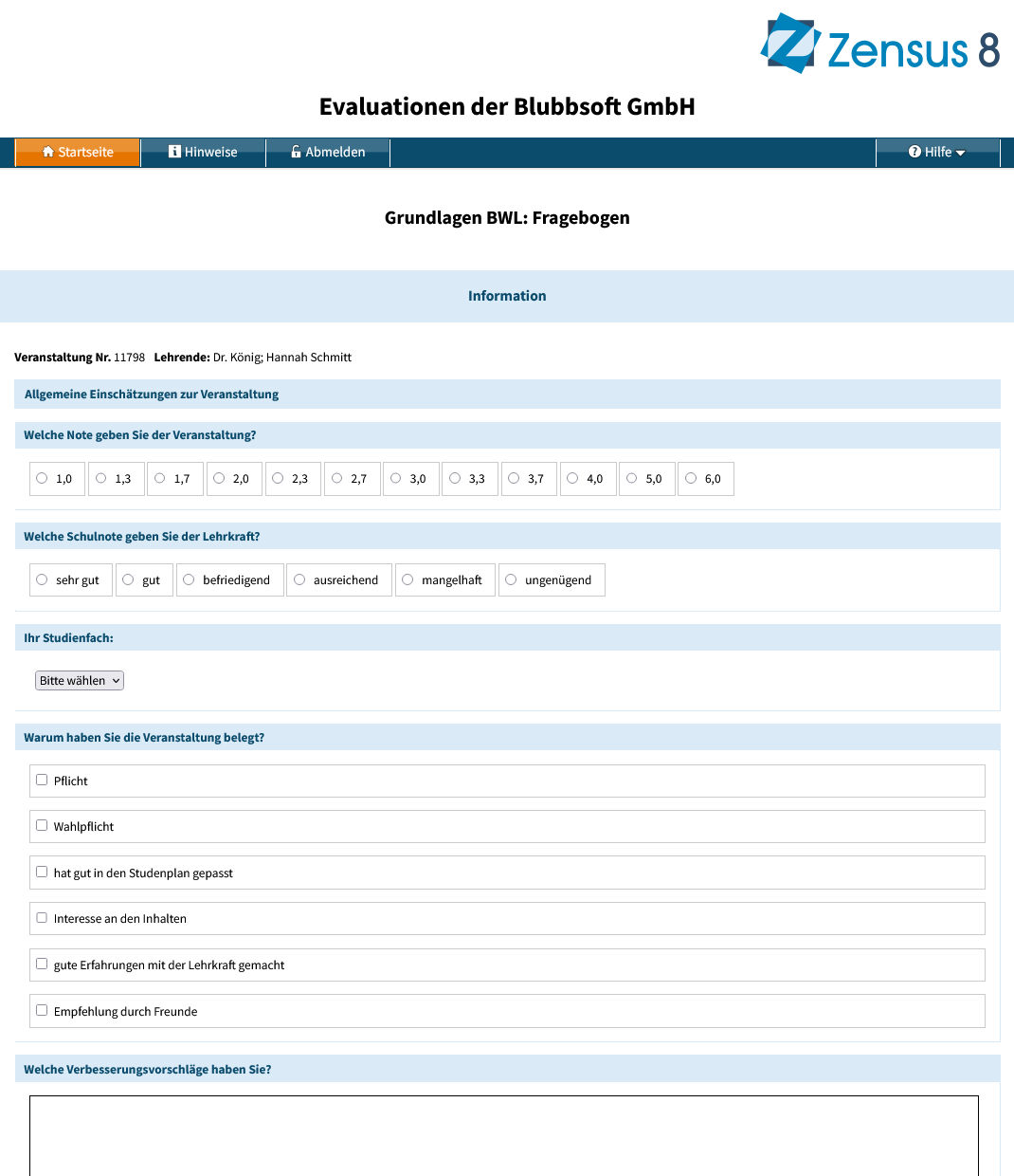 Mit Hilfe von Zensus zentral kommen maschinenlesbare Evaluationsbögen zum Einsatz, die neben hochschulweit standardisierten Fragen auch individuelle, auf die konkrete Veranstaltung abgestimmte Fragen enthalten. Dabei können alle gängigen Fragetypen, wie Single-Choice- und Multiple-Choice-Fragen, frei definierbare Skalenfragen, Zahlenwertfragen, aber auch Freitextkommentare verwendet werden. Die individuellen Fragen erscheinen dann zusätzlich mit auf dem Fragebogen und werden automatisch mitausgewertet.