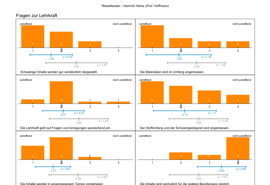 Zusätzlich zur Standardauswertung als PDF-Datei erhält jede Lehrkraft eine navigierbare Auswertung im E-Mailanhang, mit der sie die Ergebnisse selbständig genauer untersuchen kann. Jetzt ist es möglich, die Ergebnisse interaktiv nach Zusammenhängen zwischen verschiedenen Fragen der Evaluation zu filtern und diese mit den Studierenden zu besprechen. So wird Vertrauen geschaffen, und alle Betroffenen können sich aktiv in die Verbesserung der Lehre einbringen.