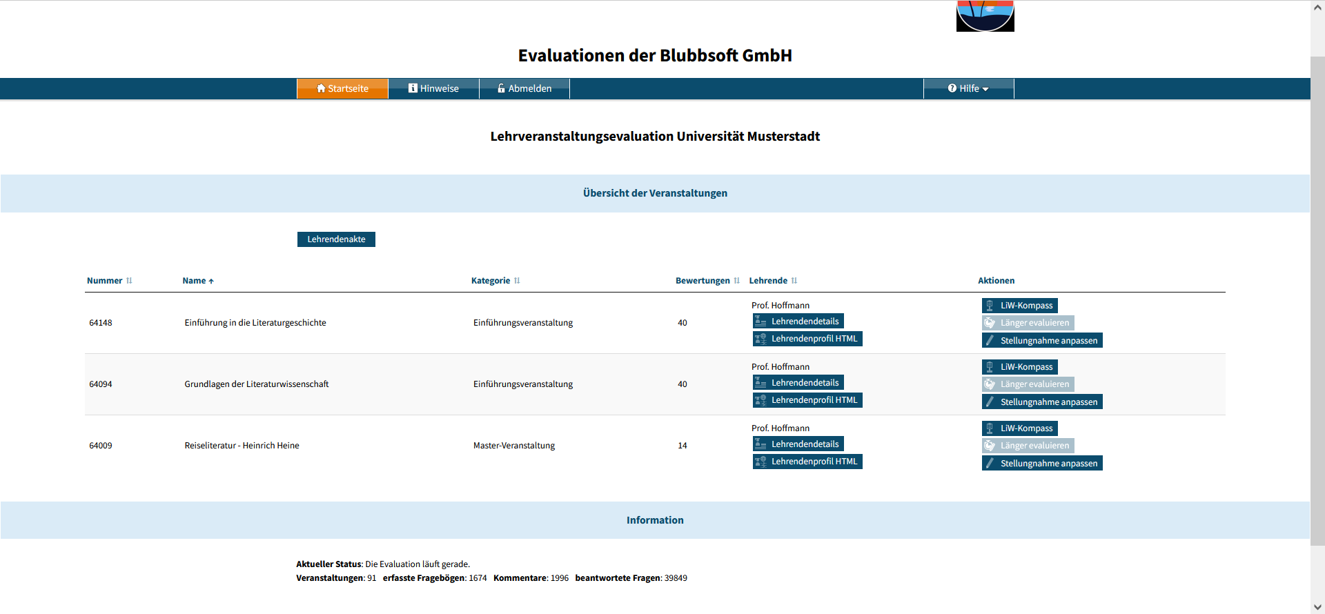 Reduzieren Sie den organisatorischen Aufwand Ihrer Evaluation, indem Sie den Lehrenden selbst ermöglichen, ihre Wünsche und Bitten direkt im Evaluationsportal umzusetzen. Egal, ob sich die Teilnehmendenzahlen, Thema oder Format einer Veranstaltung ändern – mit Portalzugriff, können Lehrpersonen ihre Seminare und Vorlesungen einfach selbst aktualisieren.