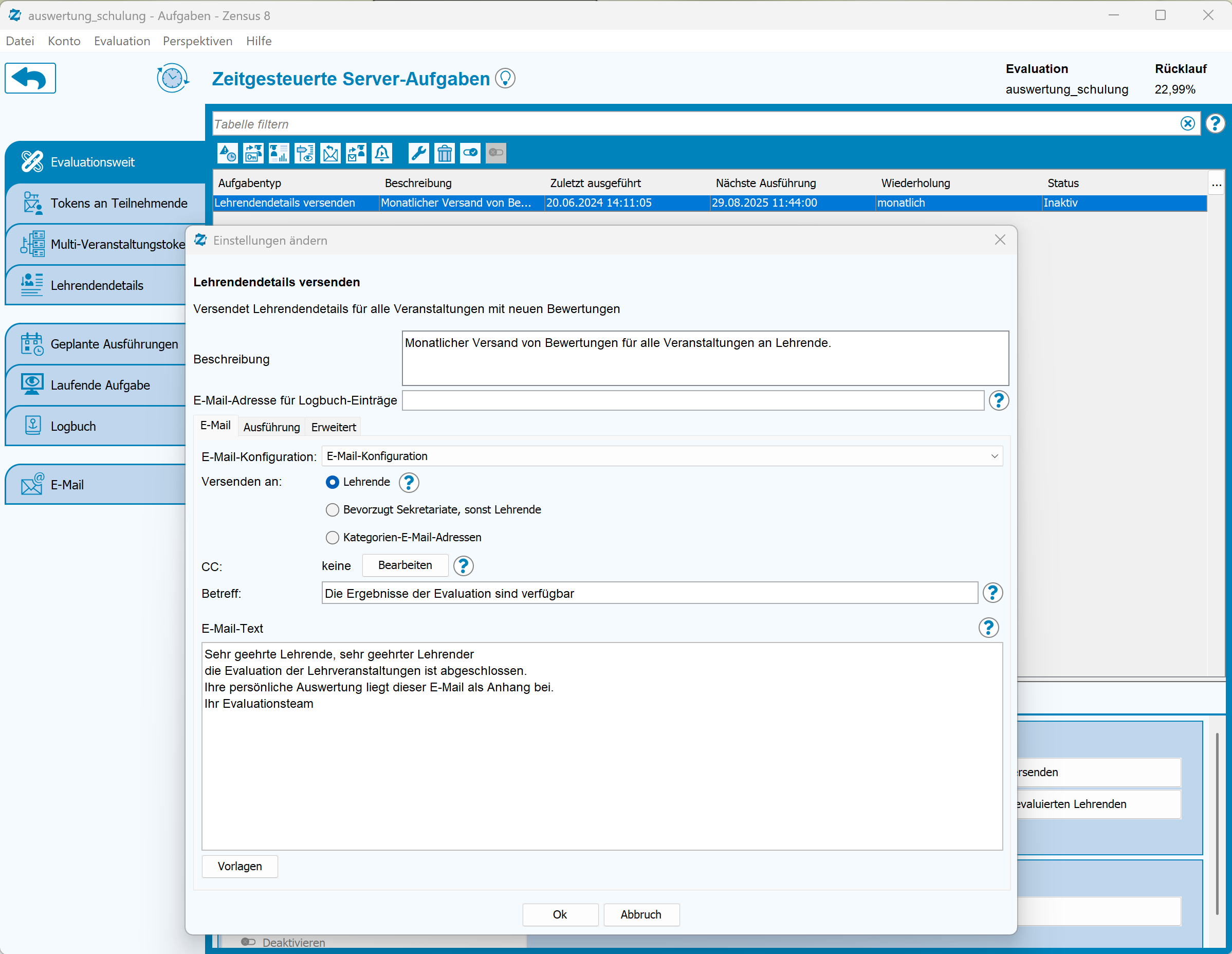 Dabei entscheiden Sie, wie oft und wann genau das passieren soll: Die zeitgesteuerten Server-Aufgaben richten sich nach dem Evaluationszeitraum der jeweiligen Veranstaltung, so dass Sie sicher gehen können, dass alle E-Mails zur richtigen Zeit eintreffen.