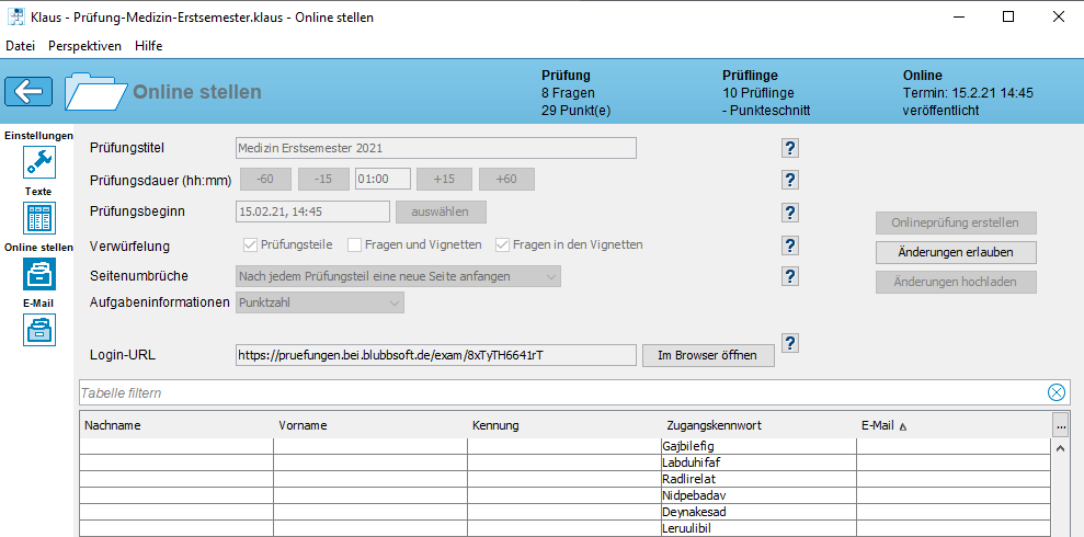 Die Teilnahme erfolgt nur nach Anmeldung mit einem persönlichen Passwort, das Sie den Prüflingen bequem per E-Mail zusenden. Zum Beginn der Prüfungszeit können die Prüflinge nun von allen Endgeräten teilnehmen. Die Ergebnisse stehen unmittelbar der Prüferin beziehungsweise dem Prüfer nach dem Ende der Onlineprüfung zur Verfügung und können mit einem Knopfdruck abgerufen werden.